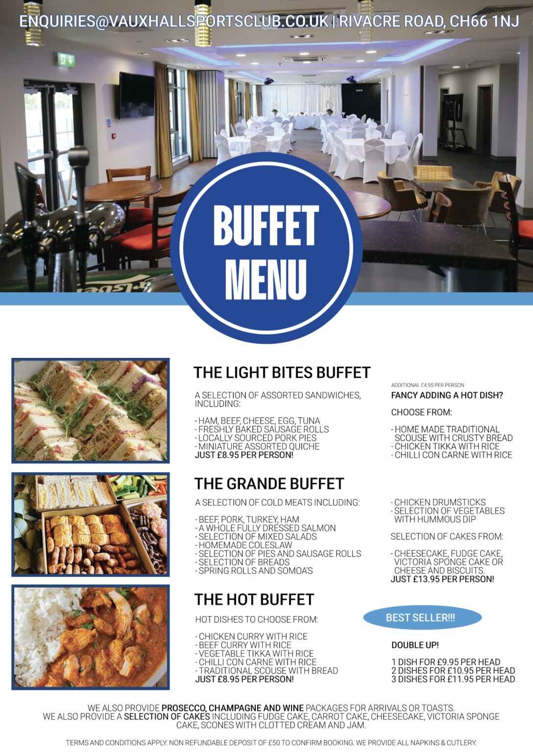 Surround yourself in a pleasant country atmosphere for your party or function at our brand new and modern facility here at Vauxhall Sports Club. Our large venue, including the fantastic Rivacre Suite, offers a wide range of facilities including ample parking, catering options and two large function suites with adjoining bars. All of these facilities are complemented by 50 years experience in providing the highest level of customer service, meaning you can be confident that your event will be delivered to the very highest standard.